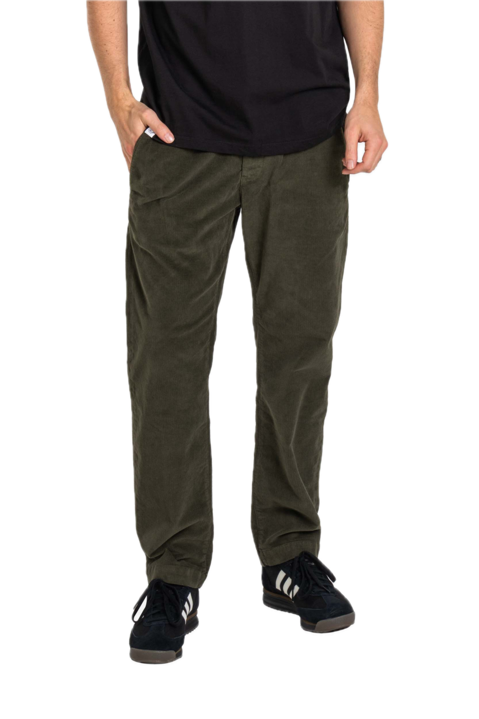 De Reflex Loose Chino Olive Square Cord is gemaakt van Flex Cord stof, een zachte corduroy met een subtiel vierkant patroon en net genoeg rek voor bewegingsvrijheid. Ultra-relaxte loose fit, elastische drawstring tailleband en een YKK ritssluiting. Klassieke chino-details en een rechte zoom die éénmaal opgerold een frisse afwerking geeft. Beinöffnung van 42cm. Het model bij Reell meet 1,87m en draagt M normaal (totaallengte 107cm). Olive is een gedempte, warme groentint die makkelijk combineert en lang meegaat.