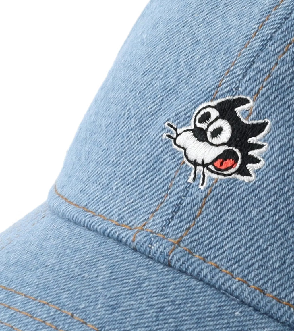 Light blue denim 6-panel dad cap met contrasterende bruine stiknaad die de panelen en de klep afzetten. Geborduurd Malvin The Cat hoofd op de front crown als subtiel maar herkenbaar detail. Ongestructureerde, low-profile pasvorm die comfortabel zit en direct goed staat. Verstelbare sluiting aan de achterkant voor een passende fit bij vrijwel elk hoofdformaat.